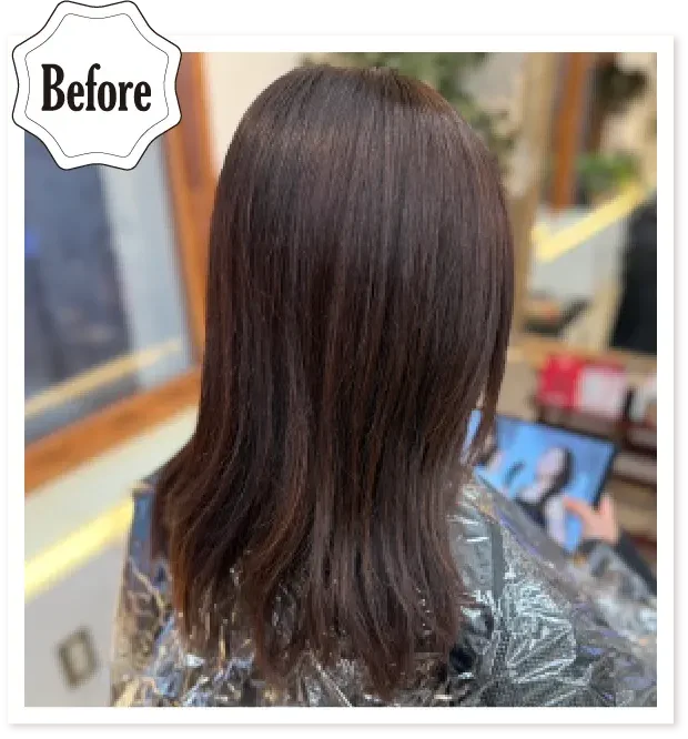 6/68を補色で使うことで、Beforeの褪色による黄味や赤味を消し、艶感と透明感はもちろん、色落ちの過程も綺麗に過ごせるように仕上げました。